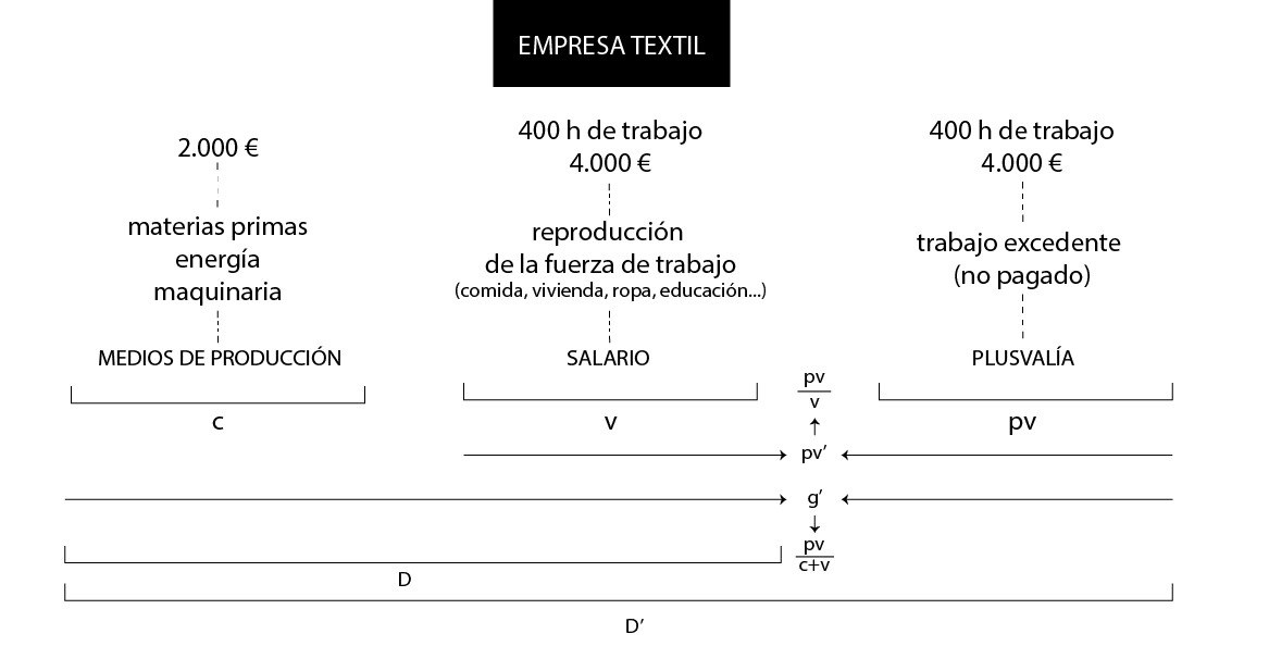 - Aquí, por tanto, la tasa de plusvalor (pv’=pv/v=4.000/4.000=100%). Es decir, el capitalista es capaz de explotar un 100% a esos trabajadores, ya que el plusvalor que están generando es igual al coste que le está suponiendo al capitalista (el salario).