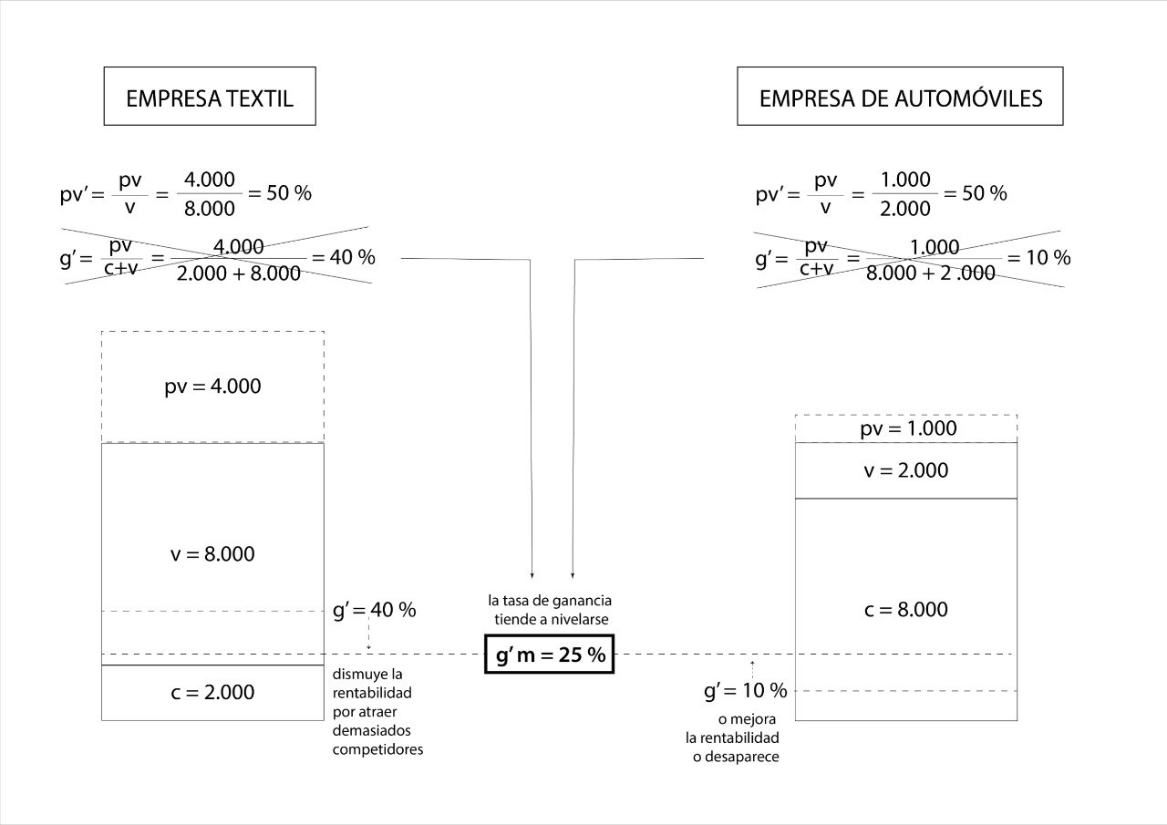 La competencia inherente al capitalismo provoca que la tasa de ganancia individual de cada capital tienda a confluir en torno a una tasa media. Por un lado, ningún capital se resignará a estar invirtiendo su dinero sin obtener una buena rentabilidad, y si esa rentabilidad está por debajo del promedio, esa empresa con el tiempo desaparecerá, lo que provocará una subida de la tasa de ganancia media. Por otro lado, aquellos capitales que, por cualquier motivo, sean capaces de obtener un extra de rentabilidad, precisamente ese extra, ejercerá un “efecto llamada” sobre otros capitales, lo que provocará que la tasa media de ganancia disminuya. Es precisamente a través de ese mecanismo de pugna, como la tasa de ganancia tiende a nivelarse en torno a una tasa de ganancia media, y esta es importante porque va a determinar el reparto de la plusvalía entre los capitalistas. Si volvemos al ejemplo del diagrama, la plusvalía que produce el sector textil no se la apropian esos capitalistas directamente, porque la plusvalía no es igual a la ganancia, y la ganancia tiende a nivelarse en torno a la media. Si la tasa de ganancia media es del 25%, y las ganancias se equilibran en torno a esa tasa, realmente la empresa textil estaría ganando un 25% de la D invertida (D=c+v=2.000+8.000=10.000 euros), es decir, 2.500 euros, mientras que su plusvalía equivaldría a 1.000 euros; y la empresa automovilística estaría ganando también un 25% de lo invertido (D=c+v=2.000+8.000=10.000 euros), es decir, 2.500 euros, mientras que su plusvalía equivaldría a 1.000 euros.