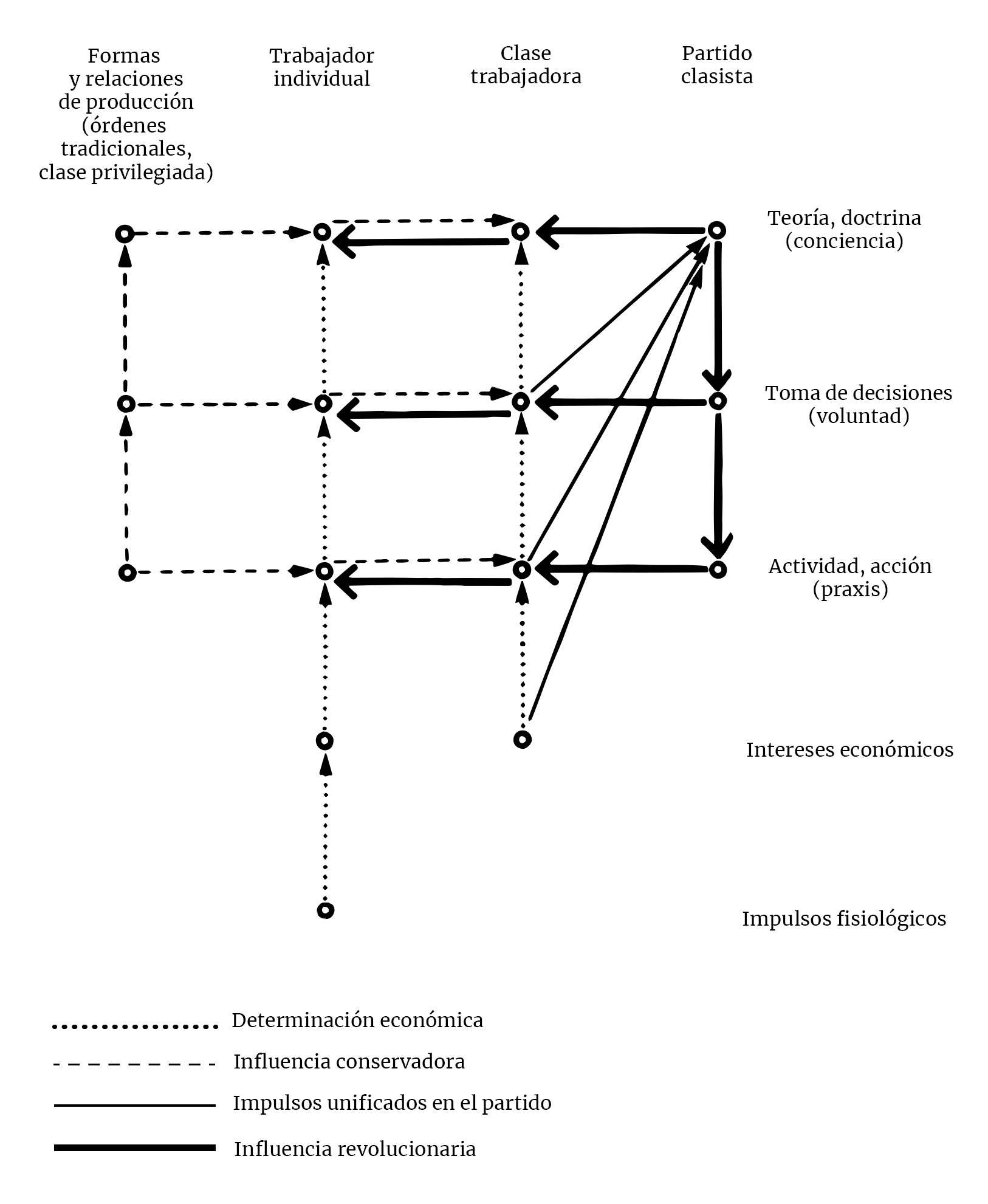 “La relación dialéctica reside en el hecho de que, en tanto el partido revolucionario es un factor consciente y voluntario de los acontecimientos, es también un resultado de los mismos y del conflicto que contienen entre las antiguas formas de producción y las nuevas fuerzas productivas. Tal función teórica y activa del partido caería, sin embargo, si se cortaran sus lazos materiales con la aportación del ambiente social, de la primordial, material y física lucha de clases.”